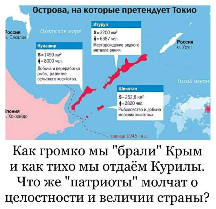 Нынешняя "питерская" команда Путина начала свою трудовую деятельность на государственном поприще тем, что ограбила блокадников в голодные и холодные девяностые. Затем объектом грабежа стала вся страна. Наивно полагать, что продажа части российской территории для людей, у которых никогда не было ни чести, ни совести, будет чем-то табуирована. В конце концов, не так давно эти же люди отдали Норвегии российскую акваторию Баренцева моря - чем Курилы должны отличаться?
