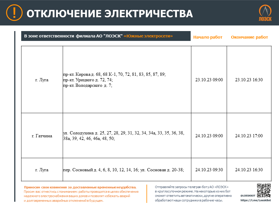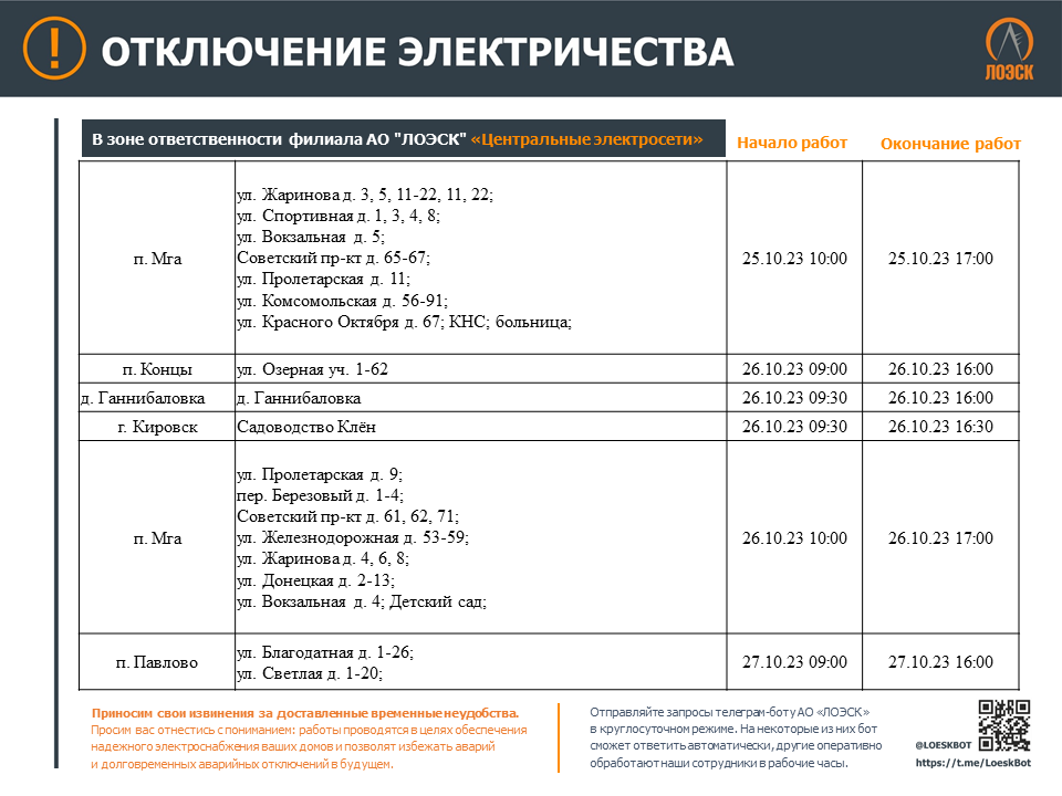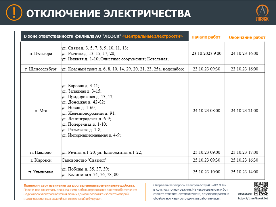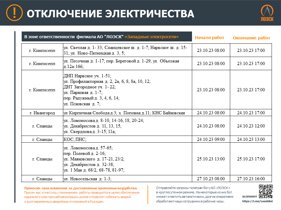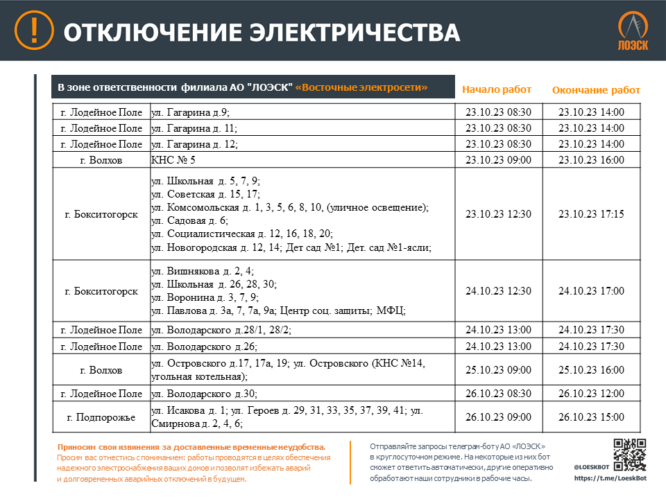 Чтобы быть в курсе плановых отключений, подписывайтесь на адресные уведомления в Телеграм-боте - https://t.me/LoeskBot