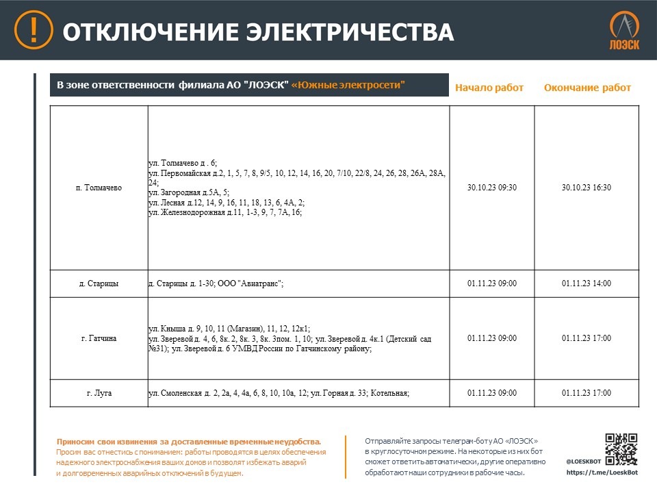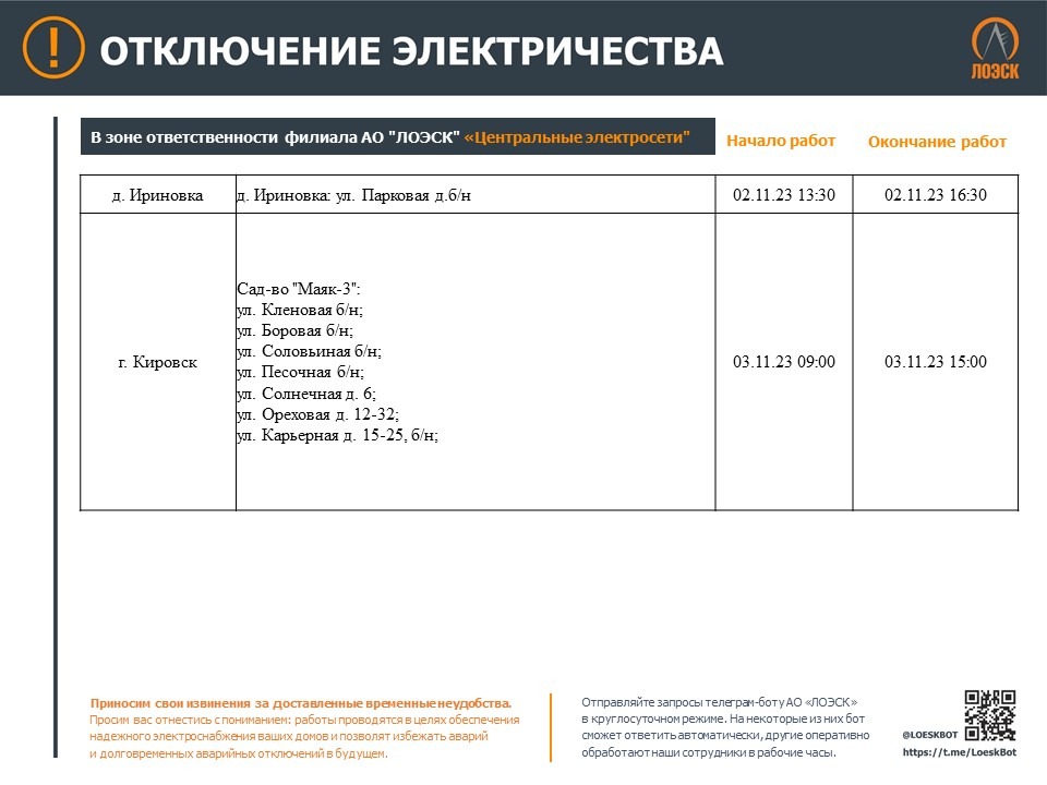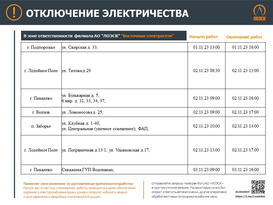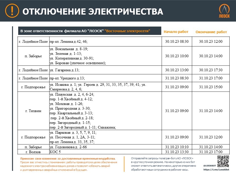 Чтобы быть в курсе плановых отключений, подписывайтесь на адресные уведомления в Телеграм-боте - https://t.me/LoeskBot