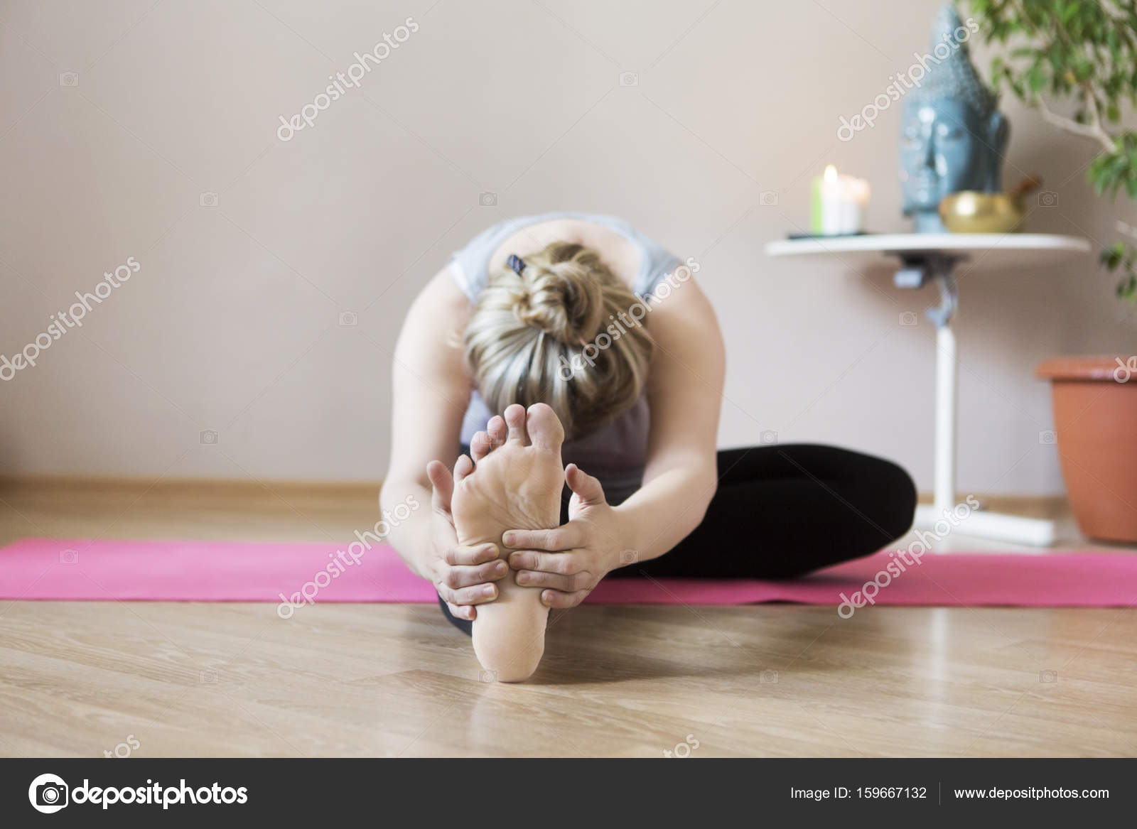 Узкоглазая докторша в голубой униформе показывает ступни и снимает белые носки