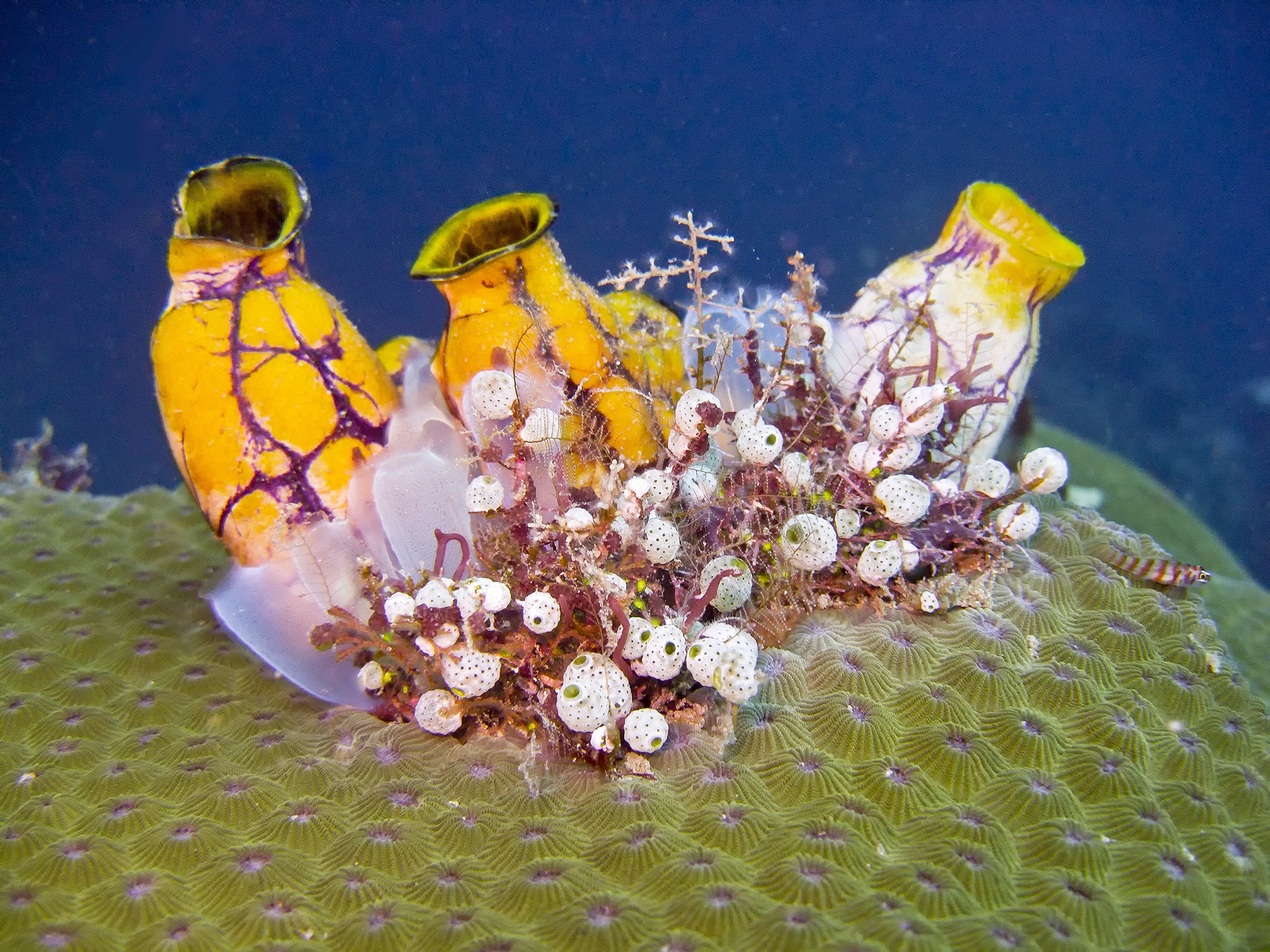 Покривники родів Polycarpa (жовті), Atriolum (білі) та Ciona (напівпрозорі) серед колонії монтастреї, Індонезія