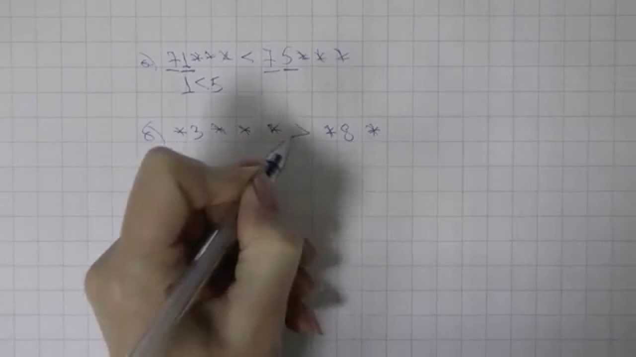 149 В числах стерли несколько цифр и вместо них поставили звездочки . Выясните, какое из чисел больше, и запишите ответ с помощью одного из знаков > или <: 71*** или 75***; *3*** или *8* - Виленкин Н .Я, 5 класс - условие и подробное . . .
