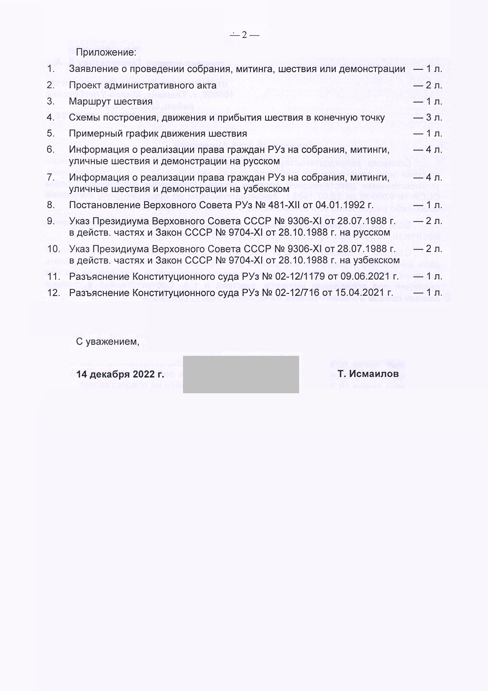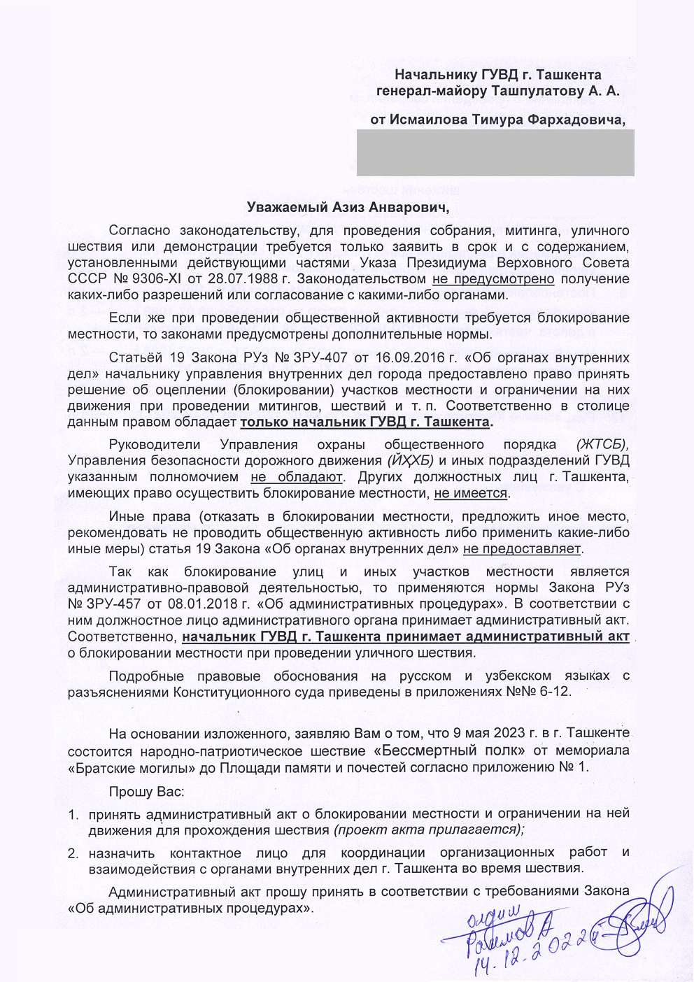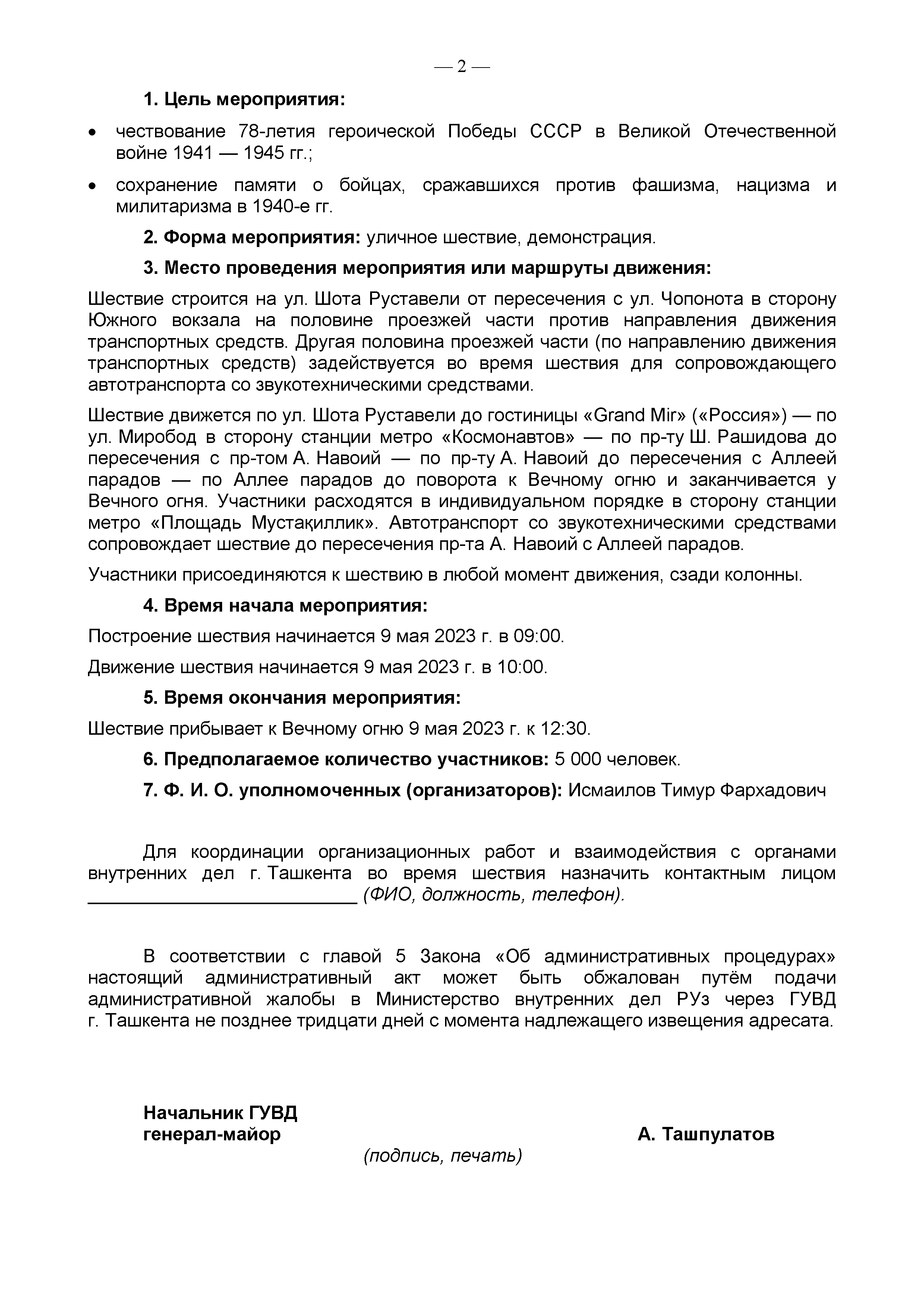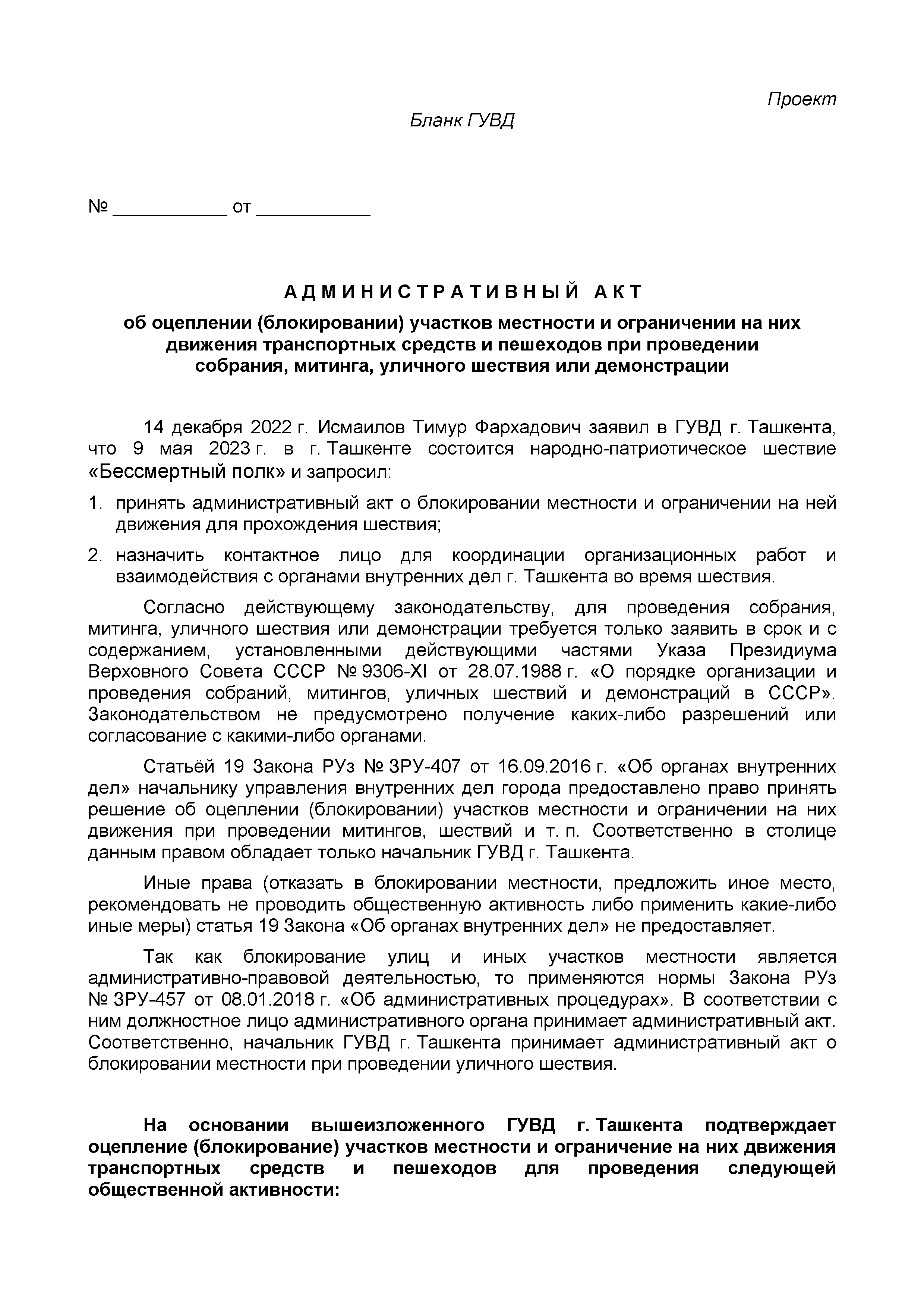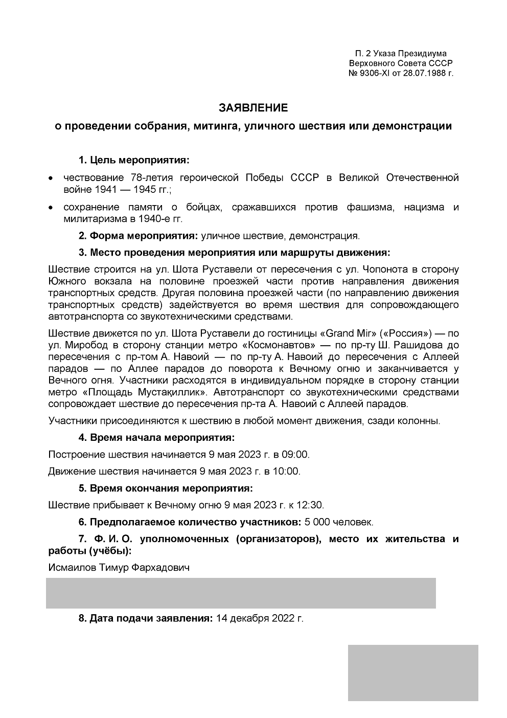 Заявление в ГУВД касательно шествия «Бессмертный полк» 9 мая 2023 года