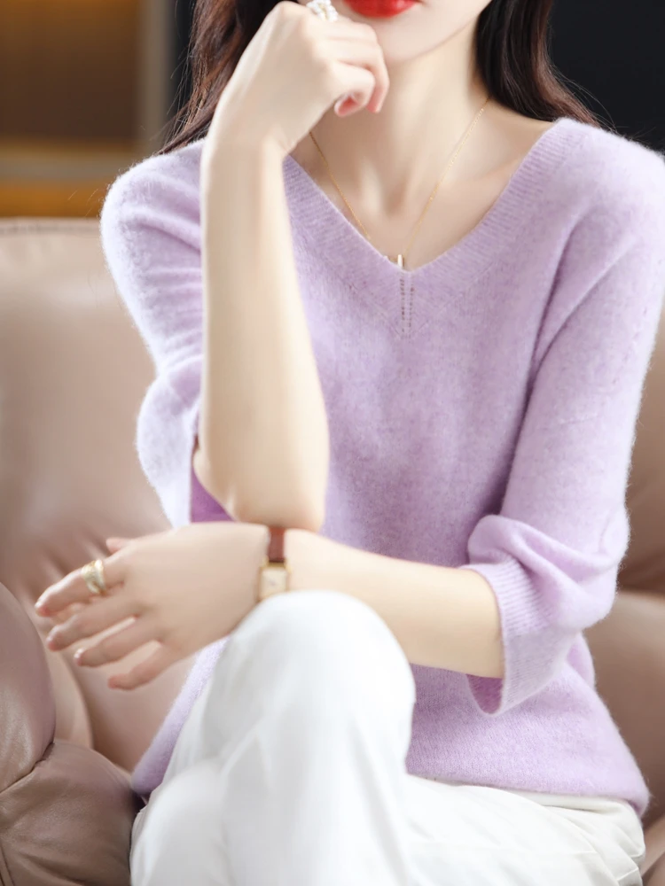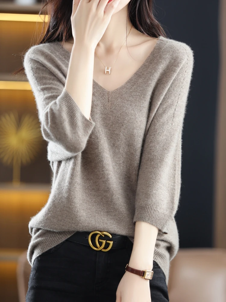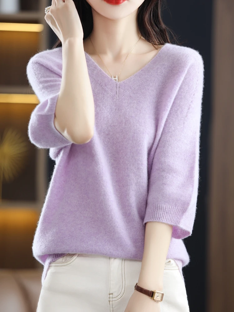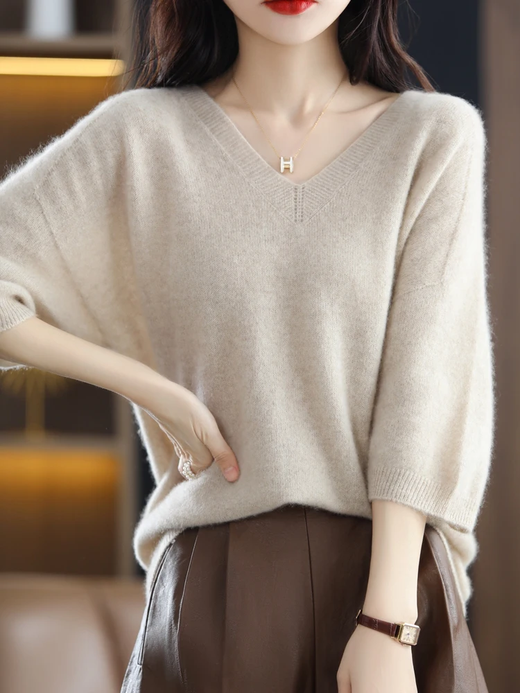 «V-Neck Women's Spring And Autumn New Pure Wool Five-Point Sleeve Pullover Sweater Loose And Thin Knitted Top» по лучшей цене на рынке! Всего за 32$ (3040рублей)