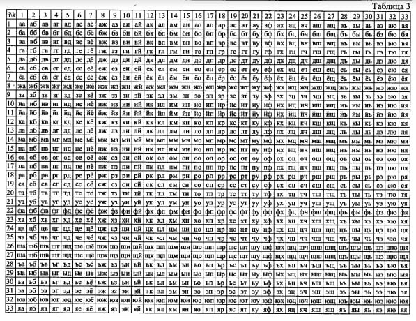 Так, для русского алфавита формирование предложений начинается с составления двухбуквенных слов. Затем путем умножения строки на каждый столбец матрицы получается полная система абсолютно всех трехбуквенных слов. Таким образом базис матриц образует все множество слов данного алфавита.