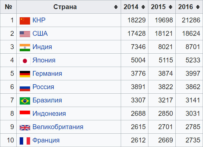 Внутренний валовой продукт по паритету покупательной способности в млрд. долларов (данные МВФ за 2016 г.)
