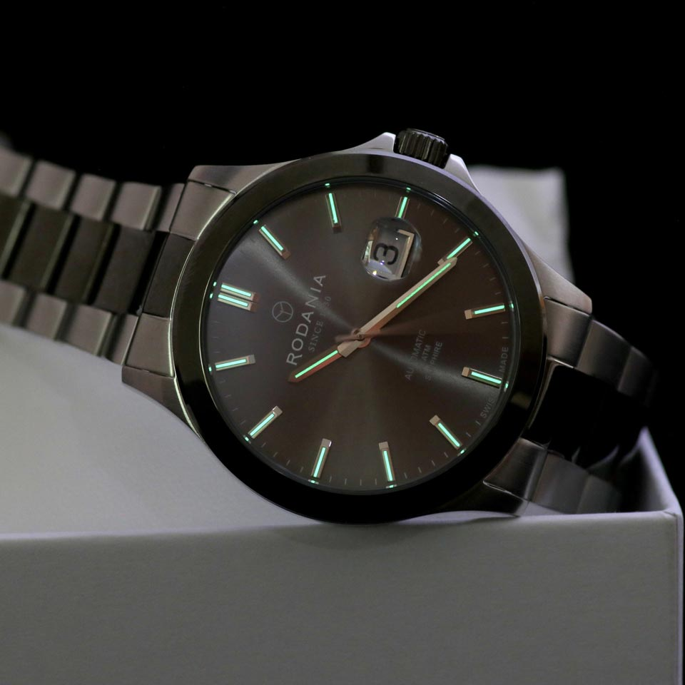 Главное отличие модели R40008 от собратьев кроется в комбинированном сочетании черного и белого. В данном и конкретном случае — это черная вставка центрального звена браслета и безель на корпусе такого же цвета на фоне остальных деталей из нержавеющей стали. Хотя цвет, скорее, не черный, а темно-коричневый, как бельгийский шоколад. Неплохая задумка для того, чтобы выделить часы среди остальных. К слову, первый беглый взгляд заставляет вспомнить о Rado D-Star, хотя, на самом деле, у этих часов мало общего. У Rado, например, основным материалом заявлена керамика. Согласитесь, что это довольно спорный материал для часовой индустрии. Но вернемся к Rodania. 42 мм — универсальный размер для корпуса. На большом запястье не теряется, на среднем не выходит за рамки. При этом в данной модели корпус не отдает синдромом кастрюли, т.е. он не толстый по высоте. Все это позволяет комфортно размещаться на запястье и не выходить за рамки манжеты рубашки. Дополнит картину впечатлений от корпуса безель цвета «бельгийский шоколад». Благодаря такому безелю, как говорилось выше, часы играют красками необычности и выделяют из толпы.