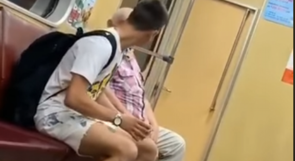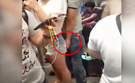 В метро парень трогает