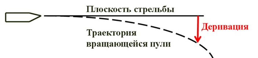 В заключении стоит упомянуть про такое явление как деривация. Это отклонение пули в сторону ее вращения. Вследствие одновременного воздействия на пулю вращательного движения, придающего ей устойчивое положение в полете, и сопротивления воздуха, стремящегося опрокинуть пулю головной частью назад, ось пули отклоняется от направления полета в сторону вращения.