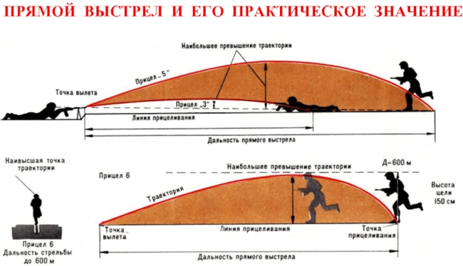 Это расстояние, на протяжении которого траектория полета пули не поднимается выше данной цели. В пределах дальности прямого выстрела в напряженные моменты боя стрельба может вестись без перестановки прицела, при этом точка прицеливания по высоте, как правило, выбирается на нижнем краю цели.