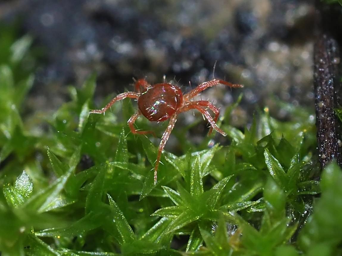 Сегодня вы познакомитесь с клещем-скороходом, представителем семейства Anystidae, возможно Anystis baccarum, как определила О.Л. Макарова из ИПЭЭ РАН, за что ей спасибо. Специального русского названия у него нет. По-английски его называют вертлявым (whirligig mite) или бешеным (crazy mite) клещем. Скороход – более точно отражает его суть и объединяет два понятия. Клещ представляет собой красный лохматый шарик на длинных ножках, диаметром около одного миллиметра, способный перемещаться с невероятной скоростью, при этом он резко меняет направление движения.
