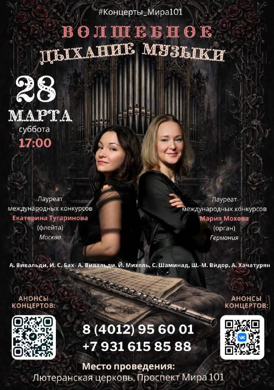 В программе концерта – произведения Антонио Вивальди и Иоганна Себастьяна Баха. 🎶 Исполняют Екатерина Тугаринова (флейта) и Мария Мохова (орган).