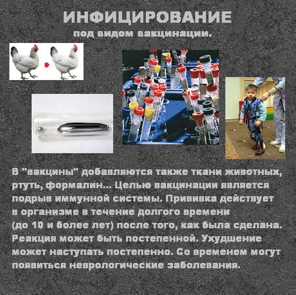 О: Несколько причин. Они вовлекают человеческий организм в процесс, целью которого является подрыв иммунной системы. Они, на самом деле, могут вызвать ту болезнь, защитить от которой предназначены. Они могут вызвать иные болезни, отличные от тех, предотвратить которые должны были.