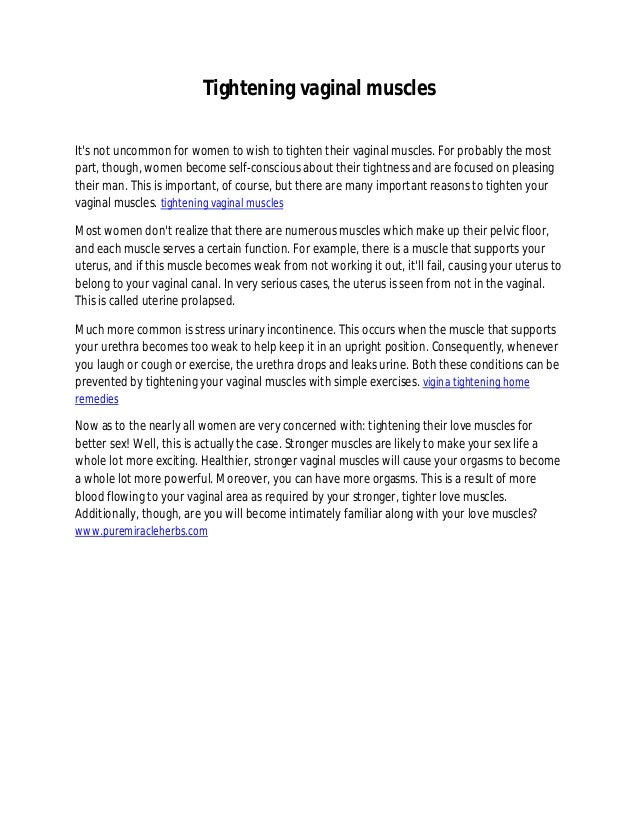 Workout . Vagina muscle tightening surgery can be a good option for working out the cervical tendons but it costs a large sum of money . Another way to obtain firm vaginal muscles is to perform certain vaginal exercises . These vulva workouts help to strengthen the walls of the vulva by the methods of "hold and release" of the vagina tendons .