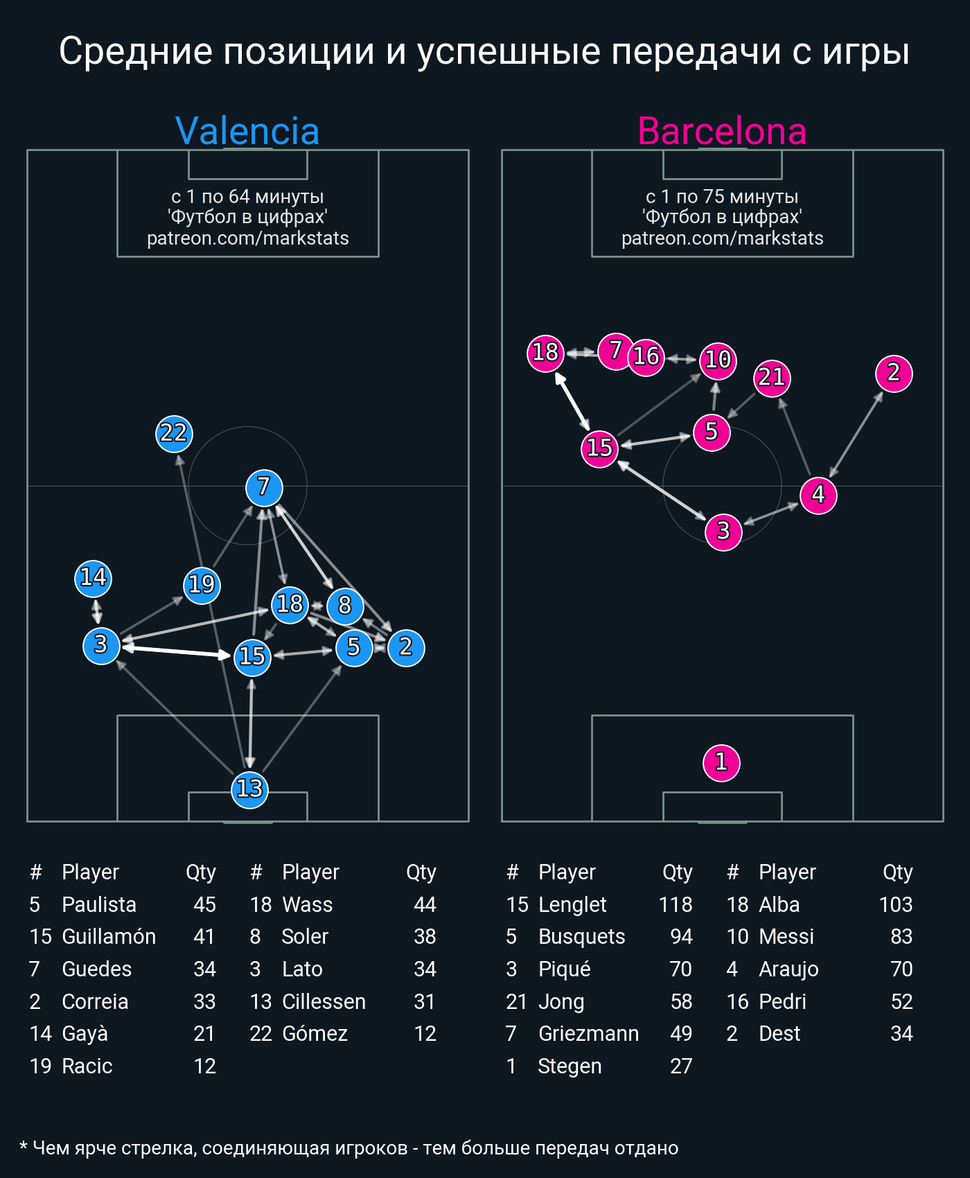 ▪ 64 успешных передач из 83 попыток (1 под удар, 7 с продвижением, 34 на трети соперника)
