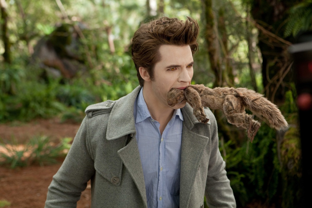 Они решают отпраздновать день рождения Бекки в кругу семьи Эдварда, которые тоже являются вампирами. Открывая подарок, Бекка ранит палец, и семья Эдварда чуть её не убивает. Понимая, что любимая может быть в опасности, Эдвард расстаётся с ней, но перед тем как уйти, спасает её от одного из кочующих вампиров по имени Джек (Чарли Уэбер), отрубив ему голову бейсбольной битой.