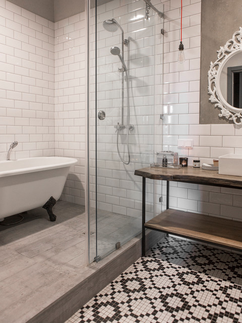 Ванная комната под бетон с деревом (69 фото)