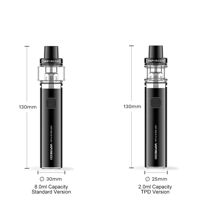 The Vaporesso Sky Solo Plus is a pen style vape mod with a large internal, non-removable battery topped off with the a huge 8ml (non TPD) integrated tank.