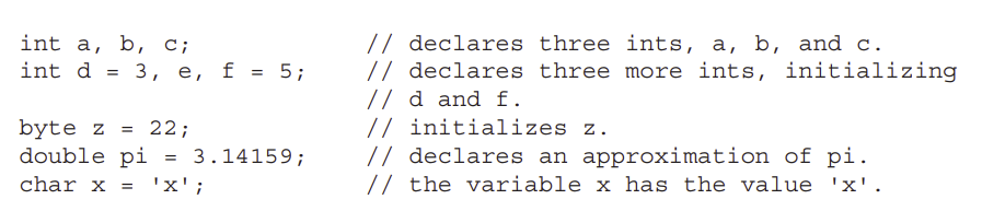 The type is one of Java’s atomic types, or the name of a class or interface. (Class and interface types are discussed later in Part I of this book.) The identifier is the name of the variable. You can initialize the variable by specifying an equal sign and a value. Keep in mind that the initialization expression must result in a value of the same (or compatible) type as that specified for the variable. To declare more than one variable of the specified type, use a commaseparated list.