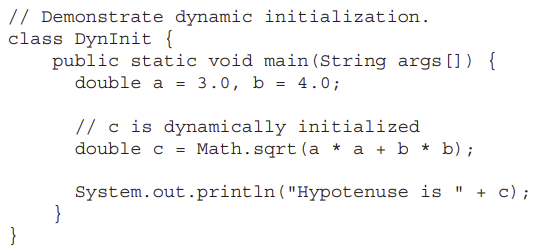 Dynamic Initialization Although the preceding examples have used only constants as initializers, Java allows variables to be initialized dynamically, using any expression valid at the time the variable is declared. For example, here is a short program that computes the length of the hypotenuse of a right triangle given the lengths of its two opposing sides: