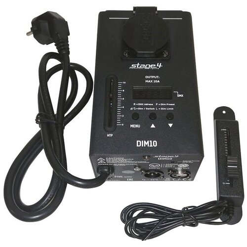 Unité variateur/commutateur portable monocanal Stage4 DIM10 Caractéristiques : Type d'appareil : Centrale de commande d'éclairage hybride. Nombre de modes : deux (mode variateur et mode commutateur). Réglage en mode variateur : 0-100%. Paramètres d'alimentation : AC 230 W, 50/60 Hz. Sortie du canal : max. 10 A (max. 2300 W). Nombre de canaux DMX : 1 (un). Sortie DMX : XLR femelle 3 broches. Entrée DMX : XLR mâle 3 broches. Type de fusible : F10A 250 V 5 x 20 mm. Contrôle : DMX-512 ou contrôle direct (3 boutons de navigation, écran LCD, 1 fader panneau et 1 fader déporté enfichable). Niveau de protection : IP20. Dimensions : 200 x 100 x 80 mm. Poids : 1,42 kg.