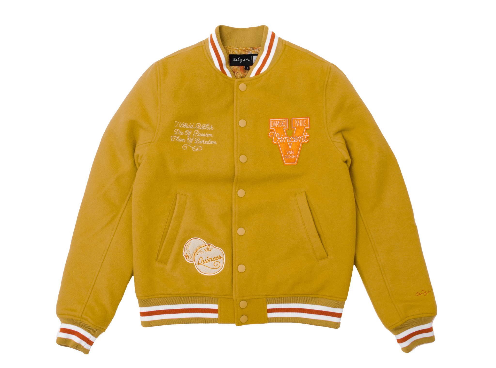The Varsity has knit trim collar cuffs and waist and a traditional snap front closure . As with all of our varsity jackets, The Varsity can be customized with your choice of inner lining, pocket trim and sleeve materials . The Varsity Jacket features: Wool body, waist length