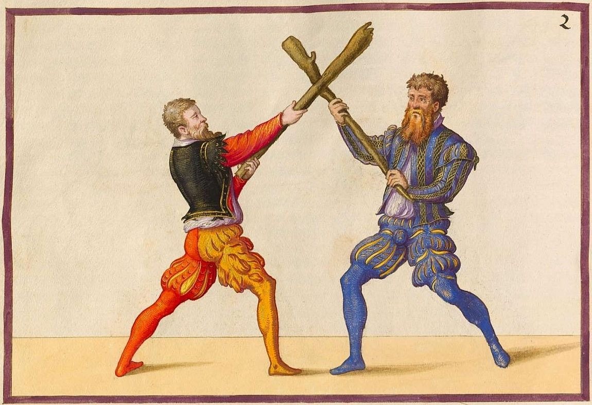 «Теперь изменилась одежда, как мужчин, так и женщин. Теперь все носят грубые шляпы, юбки и длинные полы кафтанов с многочисленными складками и разрезами, широкие рукава, дублеты с разрезами, широкие шерстяные разукрашенные воротники, широкие нагрудники, вырезы под мышками, серебряные пуговицы. Даже крестьяне позволяют себе носить шелковые дублеты. Рейтузы со сплошным высоким задним полотнищем, штанины, украшенные цветными продольными полосами и лентами, белые рубахи свободного покроя. Теперь часто носят только дублет с рейтузами, что раньше вызывало скандал. Башмаки с большими вырезами. Из оружия используются швайцердеген или кривой меч и кинжал. Кошель носят на шее, или засовывают его в гульфик, головной убор украшают большим плюмажем из страусиных перьев».
