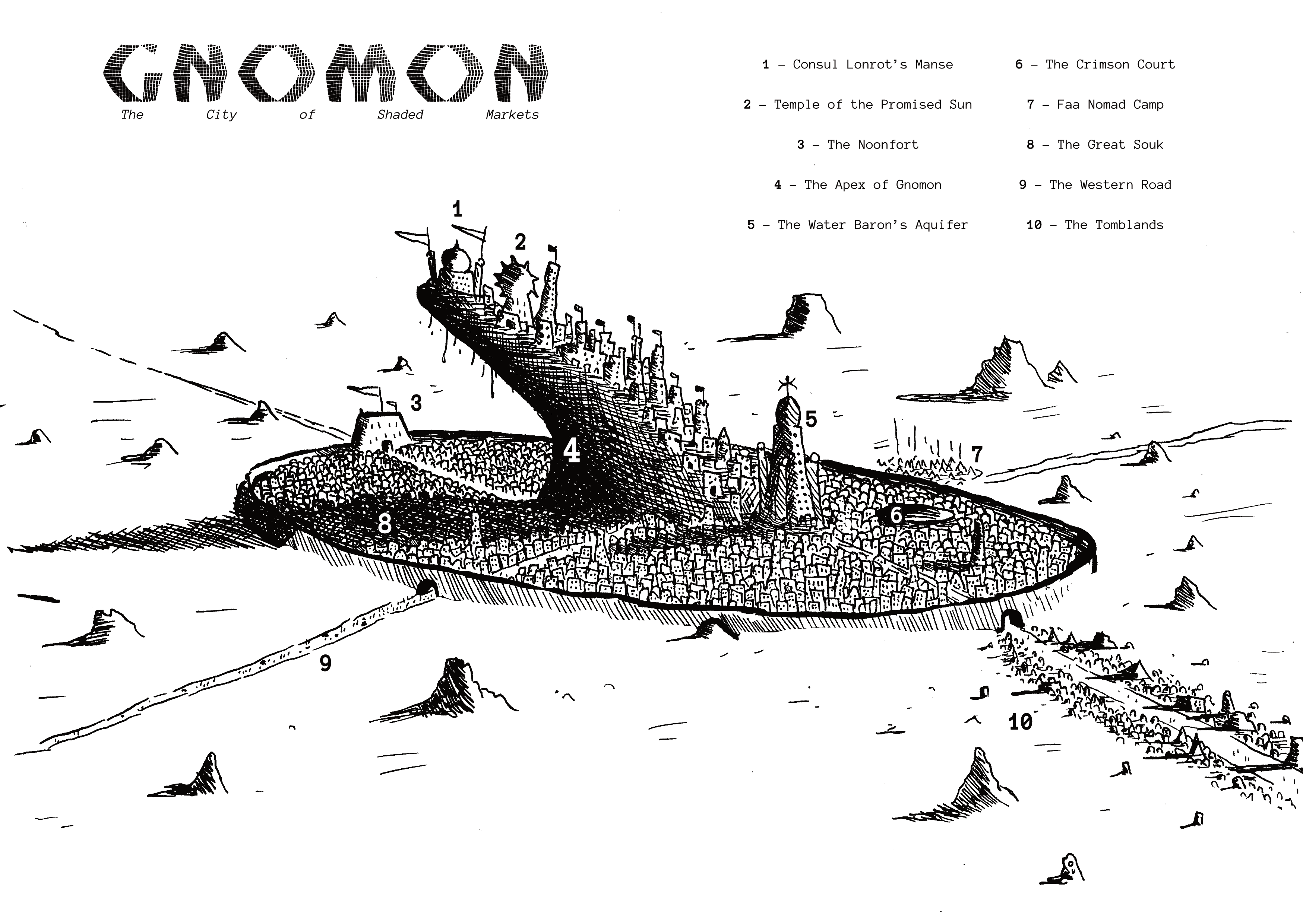 Второй зин полностью посвящен описанию города Гномона. Из него мы как бы невзначай узнаем подробности про ту же Гегемонию и ее присутствие в различных областях Ваарна, знакомимся с местными фракциями (семьи нобилей, культисты-поклонники пожирающего мозги инопланетного медведя, криминальные банды и прочие) и знаковыми персонажами (водяной барон-ростовщик, представляющий собой разумный патефон; женщина-тень из другого измерения, овца-священник культа Обещанного солнца, посол Гегемонии, капитан стражи и многие другие). Также в зине описаны подробности местной экономики, которая вся крутится вокруг воды (привет, Qud!), описание районов города.