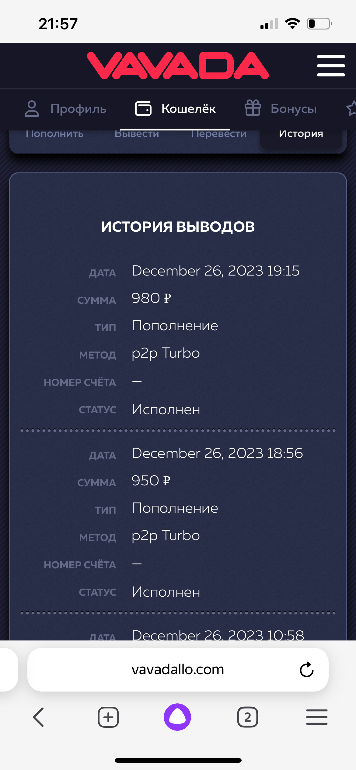 Вавада пополнение