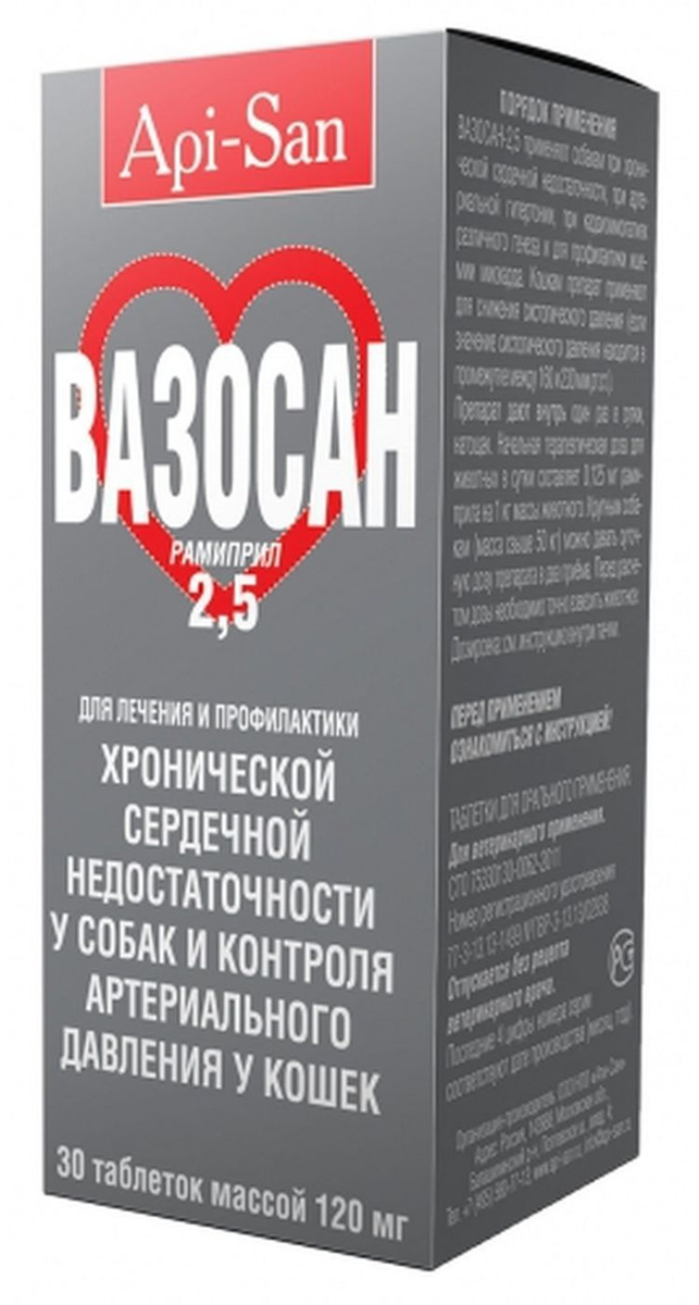ВАЗОСАН vazosan (Рамиприл) таблетки 5 мг (30 шт .) api - Препарат для лечения и профилактики хронической сердечной недостаточности у собак и контроля артериального давления у кошек . Упаковка 30 табл х 5 . . .