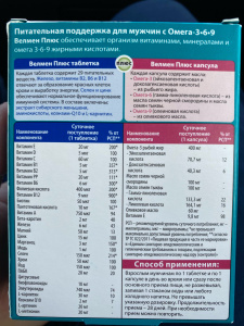Велмен Плюс предназначен для мужчин, которые ведут активный образ жизни и нуждаются в поддержании общего здоровья и энергии . Передовая формула Велмен Плюс обеспечивает организм витаминами, минералами в сочетании с правильной пропорцией Омега-3, Омега-6, Омега-9 ненасыщенных жирных кислот Каждая таблетка содержит 29 питательных веществ