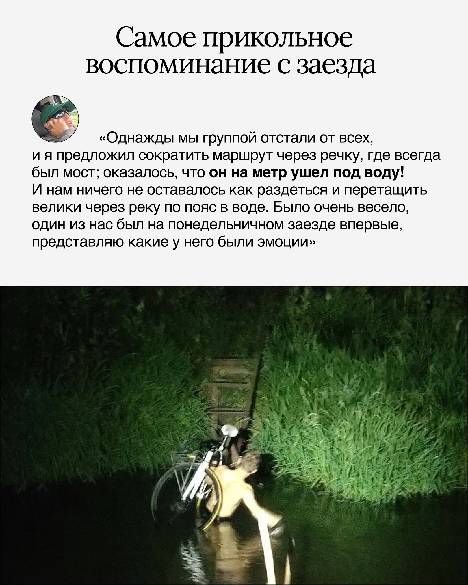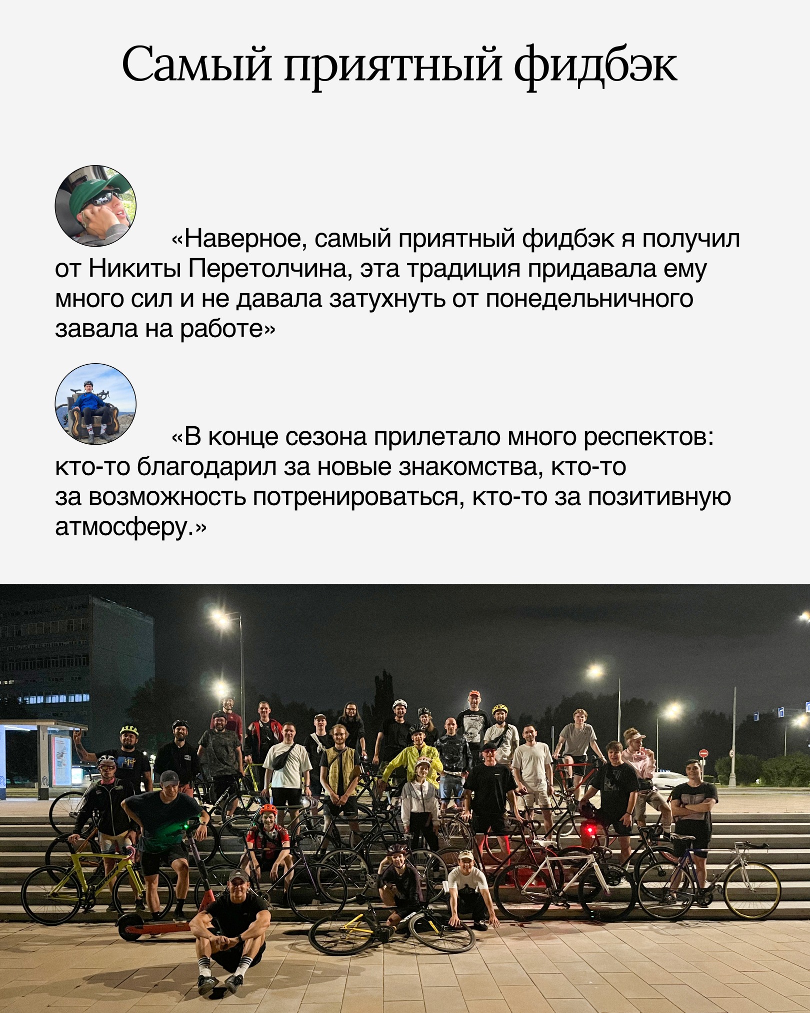 «Важным вкладом в развитие велосипедного движения в городе были локальные мероприятия, которые мы делали с 2019 года раз в год. Это были небольшие велогонки на 13-15 человек, очень домашние и задорные.» – Ваня