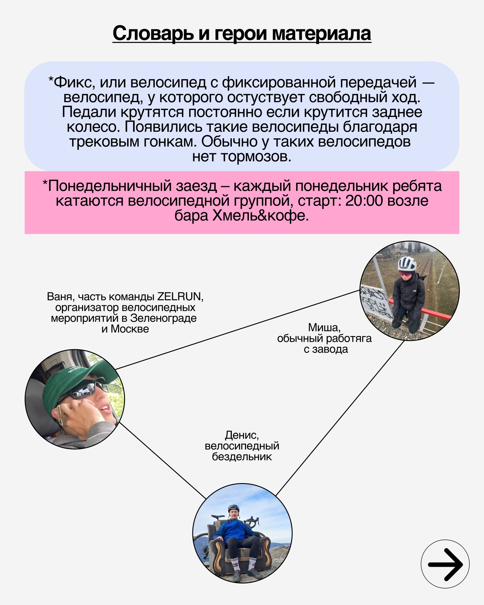 «До этого людям не с кем было кататься, – говорит Миша, – понедельничные заезды дали людям компанию и многие нашли себе новых друзей.»