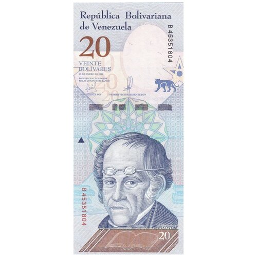 Avers Portrait de Simon Rodriguez Dénomination 20 en haut et en bas Inscription en espagnol République bolivarienne du Venezuela Vingt bolivars Payable au porteur dans les agences bancaires Reverse Jaguar Armoiries gauche Dénomination 20 dans le coin inférieur droit Inscription en espagnol Banque centrale du Venezuela Vingt bolivars Pays : VenezuelaLxLxH : 157x70x1Poids : 0, 001Dénomination : 20 bolivarsType d'émission : Pour circulationMatériel : PapierAnnée : 2018Sécurité : UNC