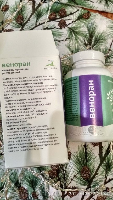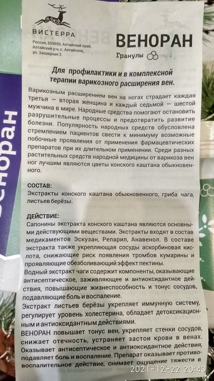 Предприятие «Вистерра» выпускает ВЕНОРАН для внутреннего употребления в гранулированной форме и в капсулах . ПРИМЕНЕНИЕ: Для терапии и в профилактике варикозного заболевания вен ног .