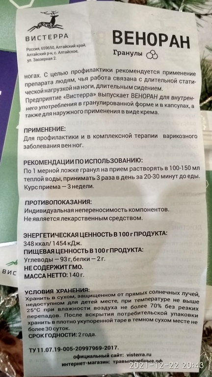 Предприятие Вистерра выпускает Веноран для внутреннего употребления в гранулированной форме и в капсулах . Применяется Для терапии и в профилактике варикозного заболевания вен ног . Рекомендации по применению По 2 капсулы 3 раза в день за 20-30 минут до еды . Курс приема - 1 месяц . Противопоказания Индивидуальная непереносимость компонентов .