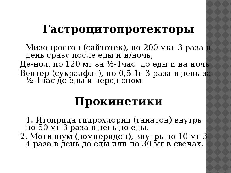 - мотилиум, по 5-10 мг 2-4 раза в день, курс - 3-4 недели (повторный курс через две недели); - вентер, по 1 таблетке (0,5 г) 3-4 раза в день, до еды, курс - 4 недели . - фосфалюгель, 3-4 недели (после отмены антисекреторных препаратов) . Следует помнить о необходимости ступенчатой отмены ИПП у детей во избежание феномена "рикошета" .