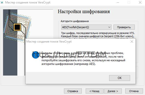Теперь важно, нам предложат выбрать алгоритм шифрования, можете погуглить выбрать сами, я выберу AES Twofish. Алгоритм хеширования - SHA-256.