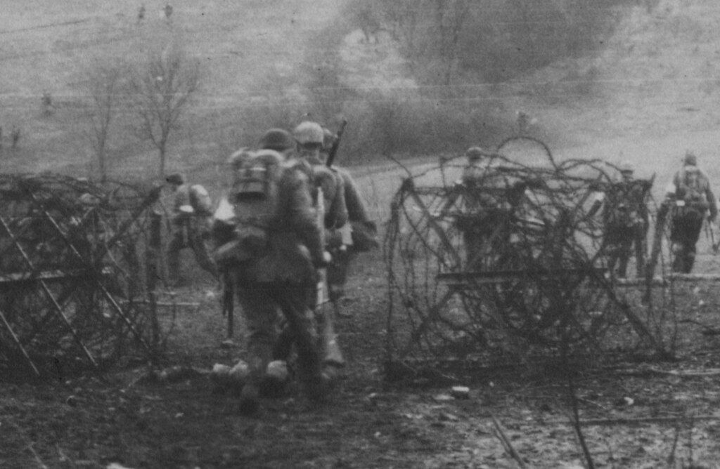 Траншеї ворога знаходяться дуже близько (80-300 метрів) В більшості місць вдалось поставити дротові загородження; зрозуміло, що вони дуже недосконалі. Але, якою небезпечною б не була ця робота, в кількох метрах від уважного ворога, командири першої лінії задавали її кожну ніч - встановлення дроту - кожну ніч. Ця кваплива робота в страшній тиші часто зупиняється, як тільки освітлювальна ракета заявиться в небі.