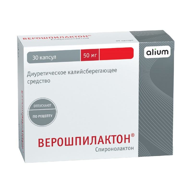 Верошпирон, 30 шт ., 50 мг, капсулы в 536 аптеках, найти аптеку Цена в Санкт-Петербурге от 203 руб . +2 Купить Действующее вещество (МНН) Спиронолактон Дозировка или размер 50 мг Форма выпуска капсулы Первичная упаковка упаковка контурная ячейковая Производитель Gedeon Richter Страна Венгрия Пройдите комплекс тестов "Кардиологический"