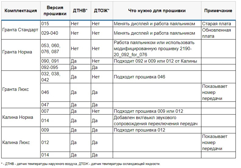 Версии прошивок гранта