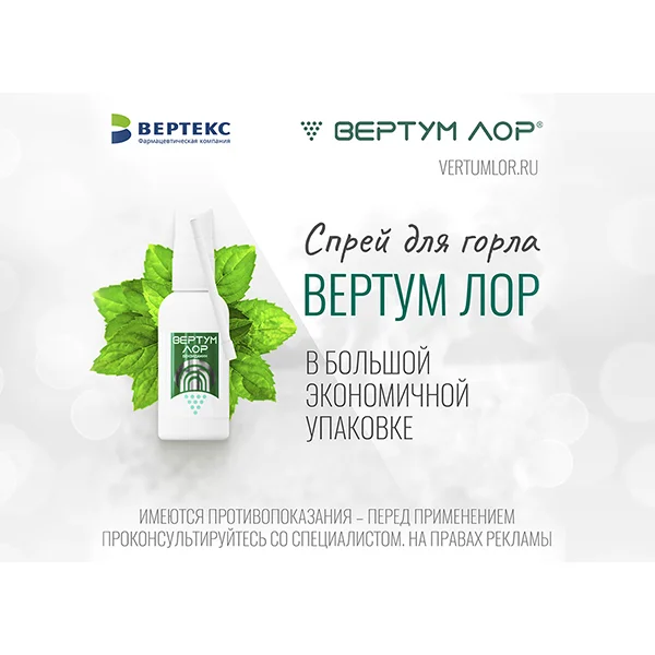 У спрея "Вертум ЛОР ® " появился новый сайт 06 .08 .2021 г . Все новости Мы обновили сайт спрея для горла и полости рта "Вертум ЛОР ® " . Это универсальный лекарственный препарат в экономичной упаковке объемом 40 мл, у него приятный мятный вкус и четыре действия: обезболивающее противовоспалительное антибактериальное противогрибковое
