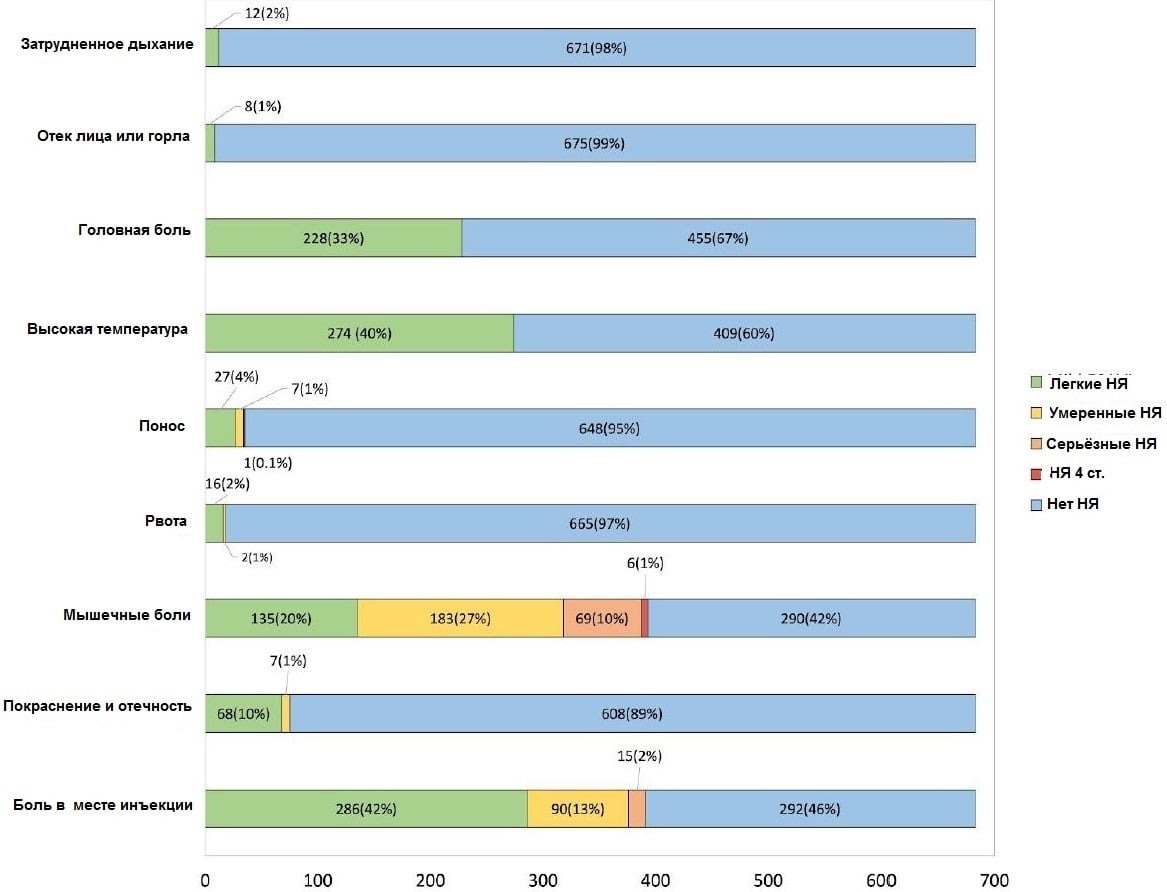 Но вот наш Спутник V долетел до Аргентины, и там нашлись ученые, которым это оказалось под силу. Они изучили местные и общие нежелательные явления в первые 72 часа после введения первого компонента этой вакцины у 683 медицинских работников Hospital Italiano de Buenos Aires. Из них 71,3% сообщили хотя бы об одном НЯ. Серьезные нежелательные явления, потребовавшие медицинского вмешательства, составили 5%, госпитализация понадобилась одному участнику.