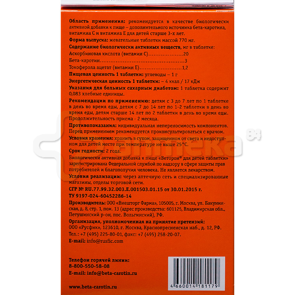 Условия хранения Хранить при температуре от +4 °С до +25 °С в сухом, защищенном от света, недоступном для детей месте . Форма выпуска Веторон для детей - жевательные таблетки массой 770 мг . Упаковка - 30 таблеток . Состав 1 таблетка Веторон для детей содержит: Бета-каротина (провитамина А) 3 мг Витамина Е 1,2 мг Витамина С 20 мг Основні параметри