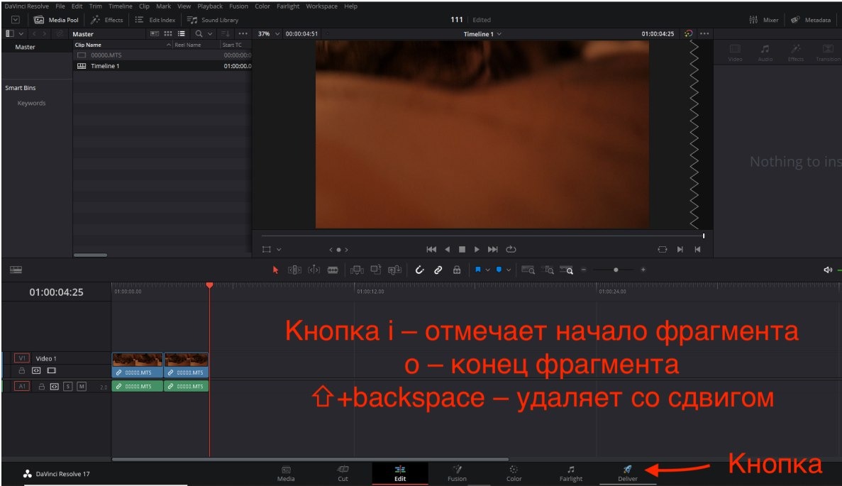 Пример работы на таймлинии, можно использовать мышь, вообще это типа монтаж, и там могут быть разные варианты. Это всё можно посмотреть в ЮТ. На этом этапе задача оставить на таймлинии только нужное.