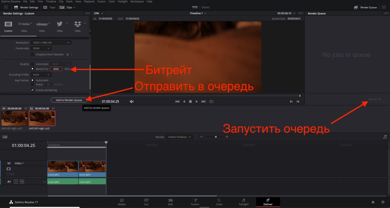 Далее важно понизить битрейт. Чем меньше битрейт, тем хуже качество и меньше весит файл. Тут можно поэкспериментировать. Но думаю 4000 норм будет.