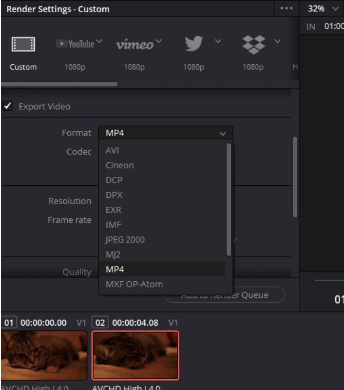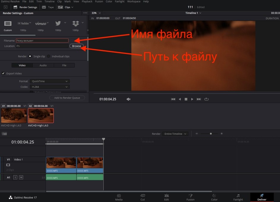 * Если формат mov по каким то причинам не устраивает. На той же вкладке Deliver нужно выбрать MP4 вместо QuickTime