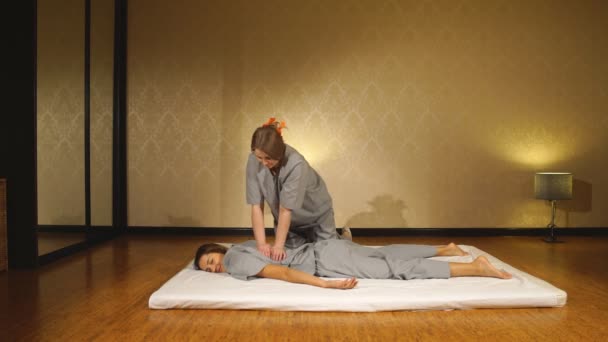 Деталь массажа физиотерапевта на спине молодой женщины, лежащей на носилках Physio, остиопатия, расслабляющий массаж, видео-ролик о лечении на спине