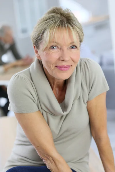 Портрет красивой пожилой женщины с седыми волосами, она улыбается, стоя у себя дома