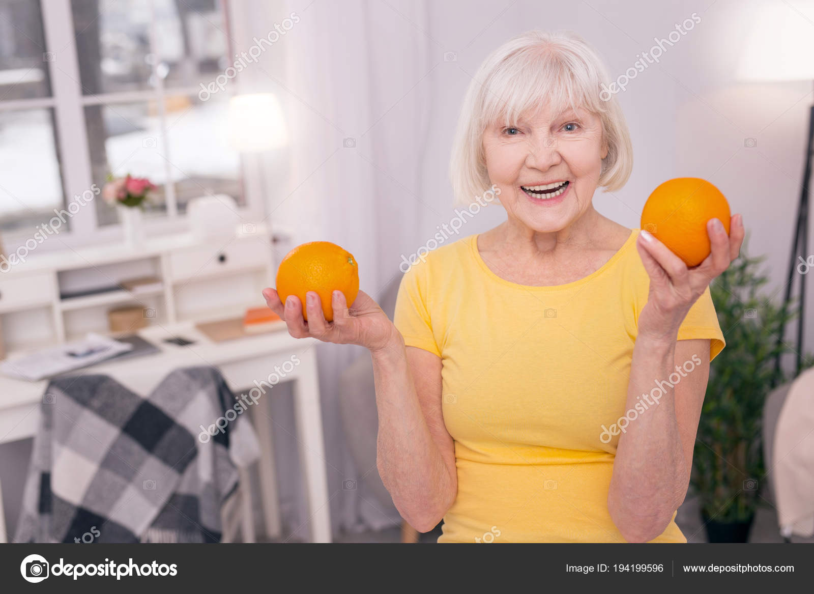фото около Портрет красивой пожилой женщины с седыми волосами, она улыбается, стоя у себя дома. Высокое качество видео 4k. изображение насчитывающей насладитесь, головка, дом - …